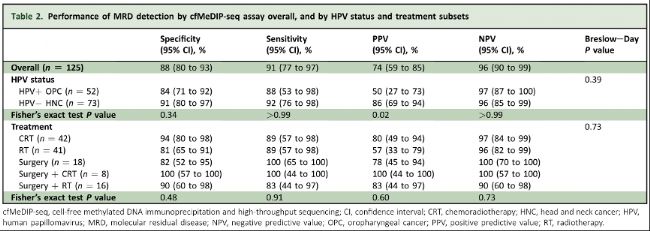 表2:按HPV狀態(tài)和治療亞組劃分的cfMeDIP-seq檢測MRD性能