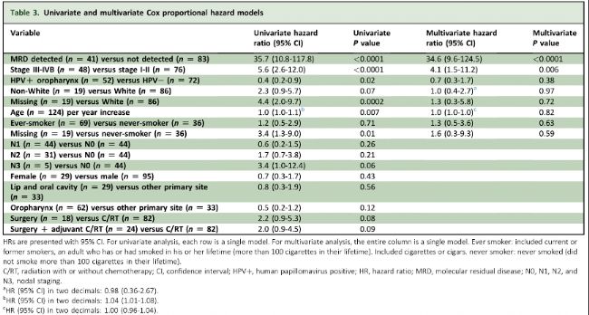 HPV陰性亞組包括HPV陰性的口咽癌(OPC)以及其他頭頸癌部位。風(fēng)險(xiǎn)比(HR)后跟括號內(nèi)的95%置信區(qū)間。HPV:人乳頭瘤病毒;HR:風(fēng)險(xiǎn)比;MRD:分子殘留病;OPC:口咽癌;OS:總生存率;RFS:無復(fù)發(fā)生存率。