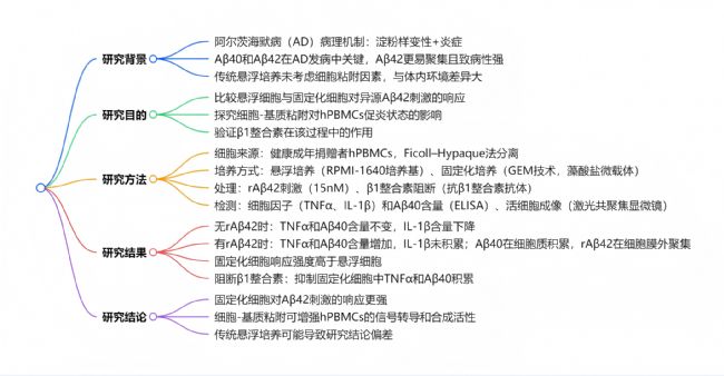 - 研究目的:探究 hPBMCs 的細胞 - 基質粘附對其體外促炎狀態(tài)的影響,比較懸浮細胞與固定化細胞對 Aβ42 刺激的響應,并分析 β1 整合素的作用13。