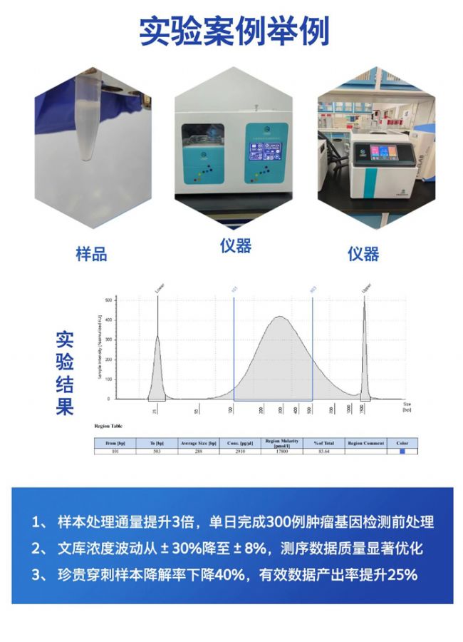 2、片段可控:采用非接觸式聚焦超聲技術(shù),1-10分鐘內(nèi)完成1-30例樣本處理。可輕松設(shè)定100bp-5kb目標(biāo)片段范圍,滿足各類(lèi)建庫(kù)需求。