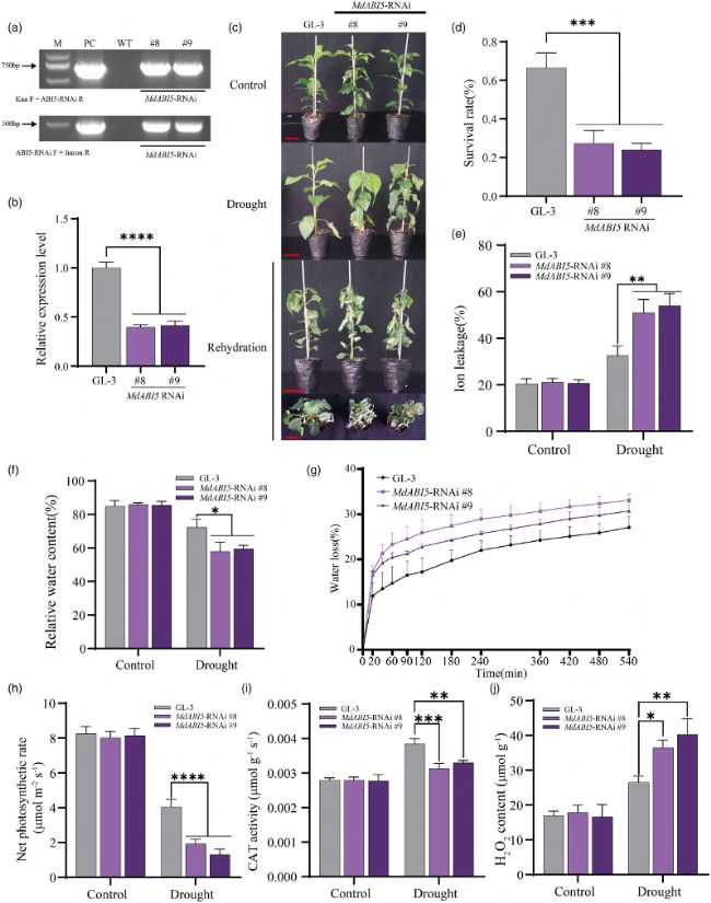 (j) GL-3和MdABI5-RNAi植株在干旱處理下的H2O2含量。
