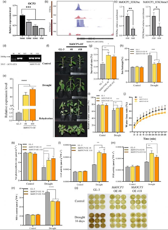 (6)組蛋白修飾調(diào)控的MdOCP3正向調(diào)控蘋果抗旱性