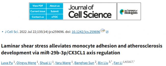 基于此,吉林大學(xué)基礎(chǔ)醫(yī)學(xué)院人獸共患病教育部重點(diǎn)實(shí)驗(yàn)室的研究團(tuán)隊(duì)結(jié)合生物信息學(xué)和分子生物學(xué)等方法,對(duì) Lss 敏感的 miR - 29b - 3p/CX3CL1 軸在體內(nèi)和體外對(duì)內(nèi)皮細(xì)胞炎癥及 AS 發(fā)生發(fā)展的影響進(jìn)行探究。研究成果發(fā)表在 Journal of cell science 期刊題為“Laminar shear stress alleviates monocyte adhesion and atherosclerosis development via miR-29b-3p/CX3CL1 axis regulation”。