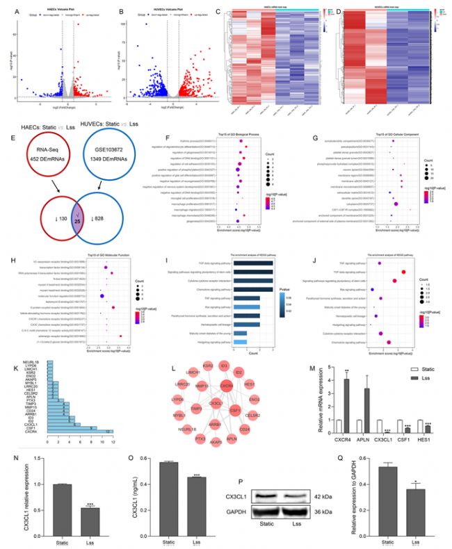 首先,為了鑒定人主動(dòng)脈內(nèi)皮細(xì)胞中 Lss 敏感的 mRNA,研究對(duì)靜態(tài)和 Lss 處理的 HAECs、HUVECs 進(jìn)行全轉(zhuǎn)錄組測(cè)序,通過 edgR 軟件篩選出差異表達(dá) mRNA。結(jié)果發(fā)現(xiàn),與靜態(tài)組相比,Lss 組中 452 個(gè) mRNA 表達(dá)顯著改變(圖 1A),其中 297 個(gè)上調(diào)、155 個(gè)下調(diào)(圖 1C)。此外,通過分析高通量測(cè)序數(shù)據(jù),對(duì)比HUVECs - 靜態(tài)組與 HUVECs-Lss 組,發(fā)現(xiàn) Lss 組中 1349 個(gè) mRNA 表達(dá)顯著改變(圖 1B),其中 496 個(gè)上調(diào)、853 個(gè)下調(diào)(圖 1D)。為探究 Lss 對(duì)血管內(nèi)皮細(xì)胞功能的影響,研究發(fā)現(xiàn)在 Lss 處理的 HAECs 和 HUVECs 中均下調(diào)的 25 個(gè) mRNA 作為關(guān)鍵 mRNA(圖 1E;表 1), 其富集的 GO 功能和 KEGG 通路與 AS 發(fā)生發(fā)展密切相關(guān)(圖 1F-J), 構(gòu)建的 PPI 網(wǎng)絡(luò)包含 21 個(gè)節(jié)點(diǎn)和 36 條邊(圖 1K,L)。研究表明,CXCR4、APLN、CX3CL1、CSF1 和 HES1 參與 AS 發(fā)生發(fā)展 。通過 qRT-PCR 檢測(cè)發(fā)現(xiàn),Lss 處理的 HAECs 中 CX3CL1、CSF1 和 HES1 的 mRNA 表達(dá)降低(圖 1M ),其中 CX3CL1 下調(diào)最顯著,且在 HUVECs 中也得到驗(yàn)證(圖 1N)。同時(shí) HAECs-Lss 組的細(xì)胞上清液和細(xì)胞內(nèi)蛋白表達(dá)量均較靜態(tài)組降低(圖 1O-Q)。上述結(jié)果表明,Lss 可降低內(nèi)皮細(xì)胞中 CX3CL1 的 mRNA 和蛋白表達(dá),證實(shí) CX3CL1 是 Lss 敏感基因。