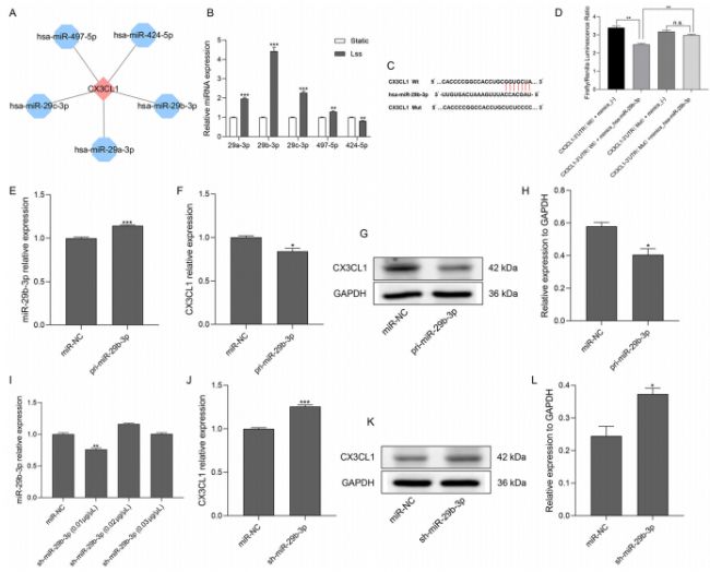 miRNA 表達(dá)對(duì)流體剪切應(yīng)力敏感,且受其調(diào)控的 miRNA 是心血管疾病治療潛在靶點(diǎn),為了分析 Lss 保護(hù)內(nèi)皮細(xì)胞功能的分子機(jī)制,研究對(duì)響應(yīng) Lss 調(diào)控 CX3CL1 表達(dá)的上游 miRNA進(jìn)行研究。研究通過借助 TargetScan 和 DIANA TOOLS 數(shù)據(jù)庫預(yù)測(cè)到 miR-424-5p、miR-497-5p、miR-29c-3p、miR-29a-3p 和 miR-29b-3p 這 5 個(gè)與 CX3CL1 存在保守結(jié)合位點(diǎn)的上游 miRNA(圖 3A,表 2)。qRT-PCR 顯示 Lss 處理后 miR-29b-3p 表達(dá)上調(diào)最顯著(圖 3B)。為進(jìn)一步證實(shí) miR-29b-3p 與 CX3CL1 的相互作用 ,研究構(gòu)建 CX3CL1-3′UTR 野生型和突變型的熒光素酶報(bào)告基因載體,以及 miR-29b-3p 模擬物和陰性對(duì)照。結(jié)果顯示 miR-29b-3p 過表達(dá)顯著抑制野生型載體的熒光素酶活性,突變型則無此效果(圖 3D)。在 HAECs 中構(gòu)建的 miR-29b-3p 過表達(dá)或敲低模型后,miR-29b-3p 的表達(dá)相應(yīng)地上調(diào)或下調(diào),表明成功構(gòu)建了 miR-29b-3p 過表達(dá)或敲低的細(xì)胞模型(圖 3E,I)。進(jìn)一步驗(yàn)證顯示,miR-29b-3p 的過表達(dá)抑制了 CX3CL1 的 mRNA 和蛋白表達(dá),而 miR-29b-3p 的敲低則促進(jìn)了 CX3CL1 的 mRNA 和蛋白表達(dá)(圖 3F-H,J-L) 。上述結(jié)果證實(shí) CX3CL1 是 miR-29b-3p 的直接靶基因。