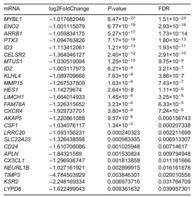 表1 在低切應(yīng)力條件下,GSE103672 數(shù)據(jù)集中 HAECs 和 HUVECs 中均下調(diào)的 mRNA。
