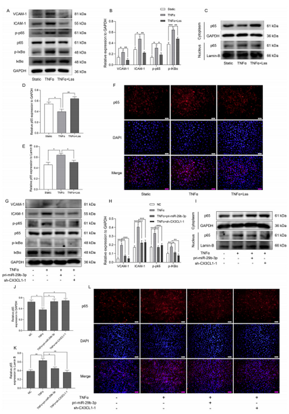 NF-κB 信號(hào)通路在炎癥調(diào)控中發(fā)揮關(guān)鍵作用,已有研究表明內(nèi)皮 miRNA 可通過調(diào)節(jié)該通路影響單核細(xì)胞黏附。為了明確 Lss 敏感的 miR-29b-3p/CX3CL1 軸調(diào)控內(nèi)皮細(xì)胞黏附的分子機(jī)制,研究分析了其對(duì) TNF-α 激活的 HAECs 中 NF-κB 信號(hào)通路的影響。實(shí)驗(yàn)顯示,Lss 能抑制 TNF-α 誘導(dǎo)的 VCAM-1、ICAM-1 上調(diào),顯著抑制 TNF-α 誘導(dǎo)的 p65 和 IκBα 的磷酸化(圖 5A,B),并且Lss 顯著減少了 p65的積累和核轉(zhuǎn)位(圖 5C-F),表明 Lss 可通過抑制 NF-κB 信號(hào)激活調(diào)節(jié)內(nèi)皮炎癥。敲低 miR-29b-3p 會(huì)逆轉(zhuǎn) Lss 對(duì) NF-κB 信號(hào)通路的抑制作用(圖 5E)。此外,miR-29b-3p 過表達(dá)或 CX3CL1 敲低均能顯著抑制 TNF-α 刺激下 VCAM-1、ICAM-1 的上調(diào)及 p65、IκBα 磷酸化圖 (5G,H ),減少 p65 核積累與核轉(zhuǎn)位(圖 5I-K) 。綜上,Lss 敏感的 miR-29b-3p/CX3CL1 軸通過阻斷 NF-κB 信號(hào)通路,減輕內(nèi)皮細(xì)胞炎癥反應(yīng)。