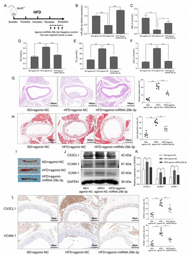 為了進(jìn)一步驗(yàn)證 miR-29b-3p 在體內(nèi)對(duì) AS進(jìn)展的調(diào)控作用,研究將 6 周齡雄性 ApoE⁻/⁻小鼠分為正常飲食(ND)組和高脂飲食(HFD)組喂養(yǎng) 4 個(gè)月,最后 1 個(gè)月注射 agomir-miR-29b-3p 或陰性對(duì)照(圖 6A) 。結(jié)果顯示,HFD 顯著降低小鼠主動(dòng)脈內(nèi)膜 miR-29b-3p 表達(dá),而注射 agomir-miR-29b-3p 可恢復(fù)其表達(dá)(圖 6B) 并抑制 CX3CL1 的 mRNA 和蛋白水平。生化檢測(cè)表明,HFD 導(dǎo)致小鼠血清 HDL-C 降低,TG、TC 和 LDL-C 升高,miR-29b-3p 過表達(dá)則逆轉(zhuǎn)了這些血脂異常(圖 6C-F)。主動(dòng)脈形態(tài)學(xué)觀察顯示,HFD 組小鼠主動(dòng)脈內(nèi)膜增厚、斑塊形成,而 miR-29b-3p 過表達(dá)顯著減小了斑塊面積(圖 6G),油紅 O 染色也證實(shí)miR-29b-3p 過表達(dá)能部分減輕 HFD 誘導(dǎo)的主動(dòng)脈內(nèi)膜脂質(zhì)沉積(圖 6H-I)。上述結(jié)果表明,miR-29b-3p 在體內(nèi)可改善 AS 進(jìn)展。