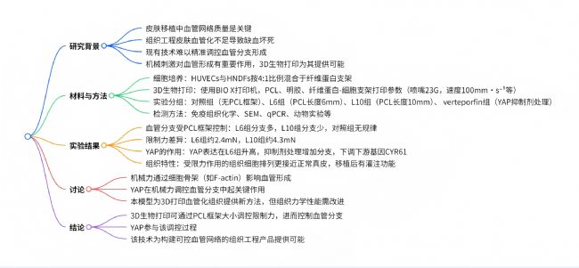 本研究通過(guò)3D生物打印技術(shù)構(gòu)建預(yù)血管化組織,發(fā)現(xiàn)改變聚己內(nèi)酯(PCL)框架大小可產(chǎn)生不同限制力,進(jìn)而調(diào)控血管分支形成;其中Yes 相關(guān)蛋白(YAP) 參與該調(diào)控過(guò)程,且細(xì)胞 - 纖維蛋白條帶寬度、力的大小與血管分支數(shù)量存在密切關(guān)聯(lián),表明工程化皮膚組織的血管化是可通過(guò)精確機(jī)械控制實(shí)現(xiàn)的復(fù)雜過(guò)程。