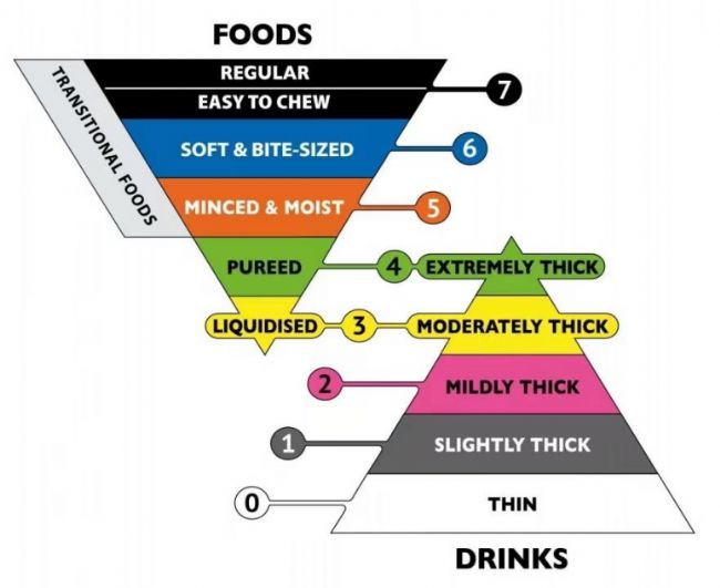 IDDSI 框架分為 8 個(gè)級(jí)別(0-7 級(jí)),以數(shù)字、文字及顏色區(qū)分:0-4 級(jí)代表飲品(正三角),3-7 級(jí)代表食品(倒三角),分別對(duì)應(yīng)不同嚴(yán)重程度的吞咽障礙患者。