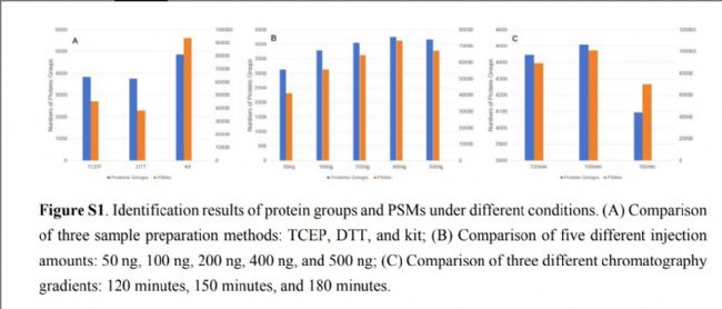 許多研究?jī)A向基于數(shù)據(jù)非依賴(lài)采集(DIA)的方法來(lái)檢測(cè)HCPs,這樣可以減少低豐度信號(hào)的缺失,提高蛋白質(zhì)組的覆蓋深度,但DIA的譜圖處理更加復(fù)雜,也容易受到復(fù)雜基質(zhì)的信號(hào)干擾。本研究中,作者選擇了以DDA的方式構(gòu)建HCPs蛋白質(zhì)譜圖庫(kù),基于該庫(kù)直接生成PRM/MRM離子對(duì)列表,可確保工藝開(kāi)發(fā)階段方法的一致性。為確保對(duì)低豐度HCPs鑒定的全面性,作者對(duì)中國(guó)倉(cāng)鼠卵巢(CHO)細(xì)胞提取的全蛋白溶液,采用了兩種不同的酶切方案:自制溶液和EasyPep MS試劑盒。結(jié)果顯示,EasyPep MS試劑盒處理的樣本蛋白鑒定更多。最終采用EasyPep MS試劑盒、400ng質(zhì)譜進(jìn)樣和150min梯度的方法進(jìn)行后續(xù)實(shí)驗(yàn)(Figure S1)。最終構(gòu)建了一個(gè)包含6863個(gè)蛋白質(zhì)、143166條多肽的譜圖庫(kù),超過(guò)了目前已報(bào)道的CHO細(xì)胞蛋白庫(kù)。