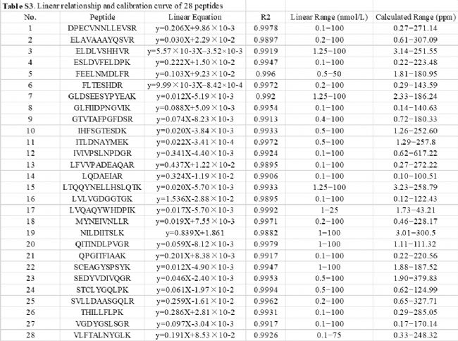 2超過(guò)0.98。結(jié)果如Table S3所示,10種肽具有良好的線(xiàn)性(0.1 – 100nmol/L),21種肽的定量下限低于1 nmol/L),25種肽的上限達(dá)到100 nmol/L。除了LVQAQYWHDPIK的線(xiàn)性范圍較窄外,所有肽均涵蓋了下游純化過(guò)程中典型的HCP濃度范圍。此外,作者又在實(shí)際條件下對(duì)穩(wěn)定性進(jìn)行了驗(yàn)證,包括在室溫(RT)下24小時(shí)的短期穩(wěn)定性、凍融穩(wěn)定性(從−80°C到室溫的三個(gè)凍融循環(huán))以及在4°C下7天的長(zhǎng)期穩(wěn)定性。所有肽在相對(duì)誤差(RE)和相對(duì)標(biāo)準(zhǔn)偏差(RSD)±15.0%范圍內(nèi)保持穩(wěn)定。所有驗(yàn)證結(jié)果均符合中國(guó)藥典對(duì)生物樣品的標(biāo)準(zhǔn),這充分證明了該方法對(duì)28種高風(fēng)險(xiǎn)宿主細(xì)胞蛋白進(jìn)行精確定量的穩(wěn)健性,適用于生物制藥過(guò)程監(jiān)測(cè)和質(zhì)量控制。
