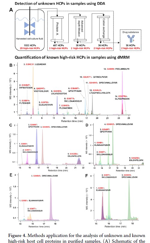 [1],首先通過(guò)數(shù)據(jù)依賴(lài)采集(DDA)構(gòu)建包含所有潛在HCPs的CHO細(xì)胞蛋白庫(kù),然后對(duì)38種已報(bào)道的高風(fēng)險(xiǎn)HCPs進(jìn)行了平行反應(yīng)監(jiān)測(cè)(PRM)和多重反應(yīng)監(jiān)測(cè)(MRM)交叉驗(yàn)證,最終篩選出28種高風(fēng)險(xiǎn)HCPs及其特異性肽段和離子對(duì)信息。下一步建立并驗(yàn)證了一種新的動(dòng)態(tài)MRM(dMRM)方法,可以同時(shí)定量28種高風(fēng)險(xiǎn)HCPs。最后,應(yīng)用上述策略分析了五個(gè)純化的單克隆抗體制備工藝樣品,通過(guò)DDA方法對(duì)未知HCPs進(jìn)行全面分析,使用dMRM方法對(duì)28種已知高風(fēng)險(xiǎn)HCPs進(jìn)行快速定量?傮w而言,該策略能夠?qū)σ阎臀粗狧CPs進(jìn)行全面分析,指導(dǎo)生物制藥工藝的優(yōu)化。本研究中DDA數(shù)據(jù)分析使用