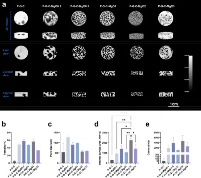 圖2 水凝膠支架的孔結構分析。(a) P-G-C、P-G-C-MgO0.1、P-GC-MgO0.5、P-GC-MgO 1、P-GC-MnO2和P-GC-MgO 3的顯微CT圖像。(b–e)每組水凝膠支架的孔隙率、孔徑、內表面積和連接性。