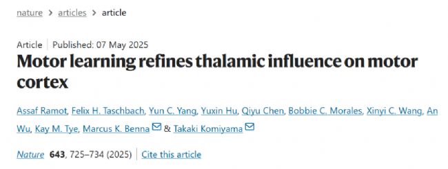 2025年5月7日,美國的學者在Nature期刊上發(fā)表了題名為“Motor learning refines thalamic influence on motor cortex”的研究論文。這項研究揭示了運動學習中丘腦對初級運動皮層(M1)調控模式的重塑機制。