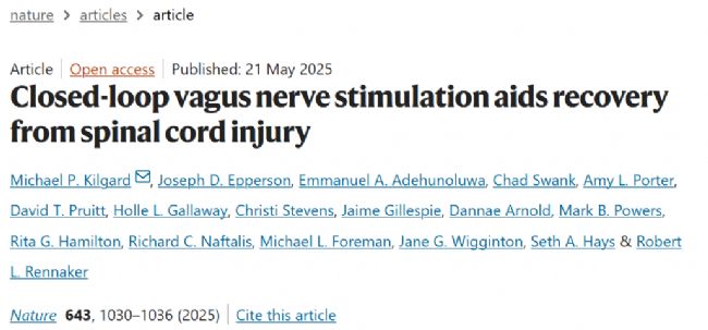 2025年5月21日,美國的學者在Nature期刊上發(fā)表了題名為“Closed-loop vagus nerve stimulation aids recovery from spinal cord injury”的研究論文。這項前瞻性雙盲隨機對照研究(NCT04288245)首次證實閉環(huán)迷走神經電刺激(CLV)聯(lián)合任務導向訓練可顯著改善慢性不完全性頸髓損傷患者上肢功能。