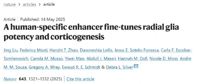 2025年5月14日,美國的學者在Nature期刊上發(fā)表了題名為“A human-specific enhancer fine-tunes radial glia potency and corticogenesis”的研究論文。該研究通過跨物種基因組編輯模型(小鼠、黑猩猩及人腦類器官),揭示人類加速進化區(qū)HARE5增強子通過調控WNT信號通路驅動大腦皮層擴張的機制。