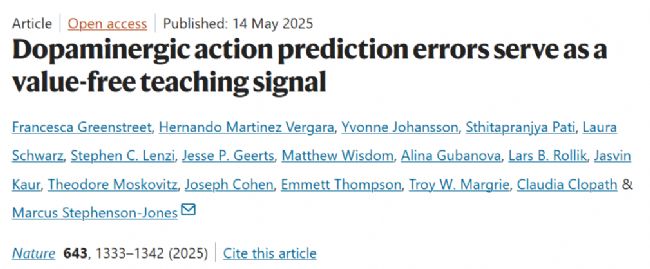 2025年5月14日,美國、西班牙的學者聯(lián)合在Nature期刊上發(fā)表了題名為“Dopaminergic action prediction errors serve as a value-free teaching signal”的研究論文。該研究通過小鼠聽覺辨別任務,揭示了多巴胺系統(tǒng)并行編碼兩種預測誤差信號以支持不同學習模式的機制。