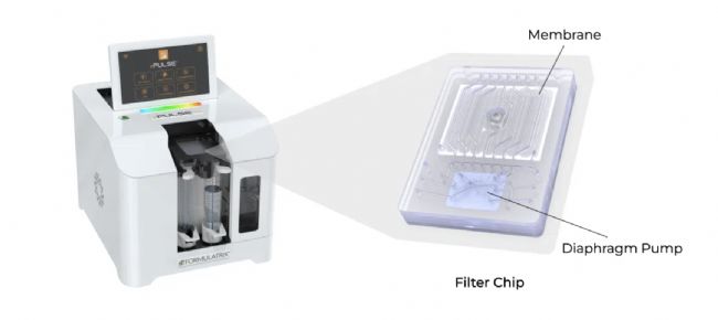 µPulse 的功能核心是其濾芯芯片,該芯片的設(shè)計(jì)融合了 TFF 與微流控泵送技術(shù)。這種集成將死體積減少至僅 650 µL,且可 100% 回收,確保對(duì)于珍貴的小體積樣品實(shí)現(xiàn)最小的產(chǎn)品損失。