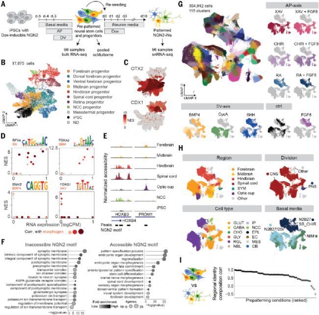 (A) 預(yù)模式化篩選與NGN2誘導(dǎo)實(shí)驗(yàn)設(shè)計(jì)。(B) 預(yù)模式化神經(jīng)干/祖細(xì)胞UMAP圖,按注釋著色。(C) 按可及區(qū)域基序富集[NES]著色的UMAP圖。(D) 基序富集與TF表達(dá)相關(guān)性散點(diǎn)圖。(E) NGN2基序可及性差異的ATAC峰示例。(F) NGN2基序可及/不可及關(guān)聯(lián)基因的GO分析。(G-H) 304,912個(gè)預(yù)模式化NGN2-iN細(xì)胞的UMAP圖,按簇身份/形態(tài)發(fā)生素來源(G)或原代注釋/基礎(chǔ)培養(yǎng)基(H)著色。(I) 預(yù)模式化神經(jīng)干/祖細(xì)胞與NGN2-iN的神經(jīng)身份組成相關(guān)性,每點(diǎn)代表一個(gè)形態(tài)發(fā)生素組合。