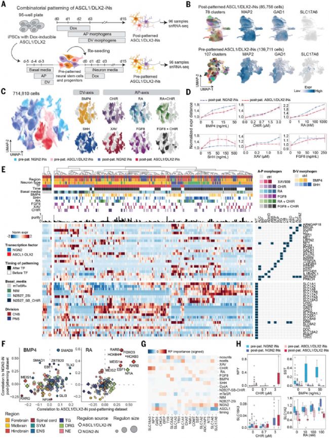 (A) ASCL1/DLX2誘導(dǎo)的預(yù)/后模式化篩選設(shè)計(jì)。(B) ASCL1/DLX2-iN的UMAP圖。(C) 430,936個(gè)神經(jīng)細(xì)胞的整合圖譜UMAP。(D) 形態(tài)發(fā)生素濃度與轉(zhuǎn)錄差異的散點(diǎn)圖。(E) 基于轉(zhuǎn)錄組距離的聚類樹狀圖,熱圖示各簇最佳條件的濃度,條形圖示簇純度。(F) NGN2與ASCL1/DLX2-iN調(diào)控子與BMP4/RA相關(guān)性比較。(G) 形態(tài)發(fā)生素對(duì)神經(jīng)遞質(zhì)/神經(jīng)肽基因表達(dá)的隨機(jī)森林預(yù)測(cè)重要性熱圖。(H) 神經(jīng)遞質(zhì)/神經(jīng)肽表達(dá)與形態(tài)發(fā)生素濃度的箱線圖。