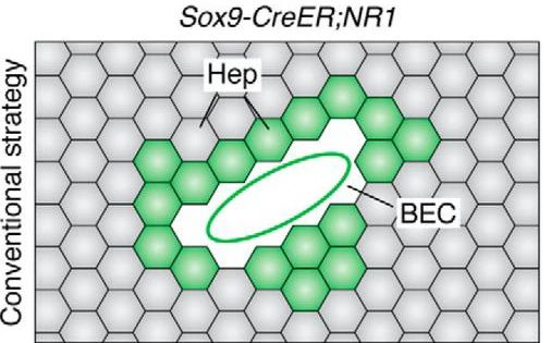 Sox9+ 膽道上皮細(xì)胞是否在肝臟再生過程中形成肝細(xì)胞仍然存在爭(zhēng)議。一些譜系追蹤研究報(bào)告說,Sox9-CreER 標(biāo)記的膽道上皮細(xì)胞(BEC)可能有助于體內(nèi)平衡和損傷后的肝細(xì)胞;其他研究報(bào)告說,新產(chǎn)生的肝細(xì)胞來源于損傷后預(yù)先存在的肝細(xì)胞。值得注意的是,Sox9 在 BEC 和一些門脈周圍肝細(xì)胞中表達(dá),這導(dǎo)致使用傳統(tǒng)的 Sox9-CreER 標(biāo)記不夠準(zhǔn)確,新的肝細(xì)胞可能來自Sox9-CreER 標(biāo)記的預(yù)先存在的肝細(xì)胞。