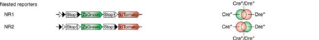 因此,嵌套報(bào)告系統(tǒng)可用于破解一些定義具有已知陽性和陰性 marker 的干細(xì)胞的細(xì)胞命運(yùn)。這種方式較獨(dú)家報(bào)告基因系統(tǒng)的優(yōu)勢(shì)是 Dre-rox 和 Cre-loxP 的重組順序不會(huì)影響最終結(jié)果,并且,嵌套報(bào)告基因系統(tǒng)更適合使用雙誘導(dǎo)型重組系統(tǒng)(例如 CreER 和 DreER)進(jìn)行細(xì)胞譜系示蹤。