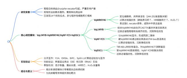 綜上,該研究揭示VqWRKY46與VqNF-YC9通過(guò)形成同源二聚體及蛋白復(fù)合體的雙重機(jī)制,協(xié)同調(diào)控VqDSC1的表達(dá),進(jìn)而介導(dǎo)葡萄白粉病抗性。研究最終闡明了VqLIMYB-VqWRKY46/VqNF-YC9-VqDSC1信號(hào)模塊的抗病調(diào)控網(wǎng)絡(luò),為葡萄抗病分子育種提供了關(guān)鍵基因靶點(diǎn)及理論支撐。