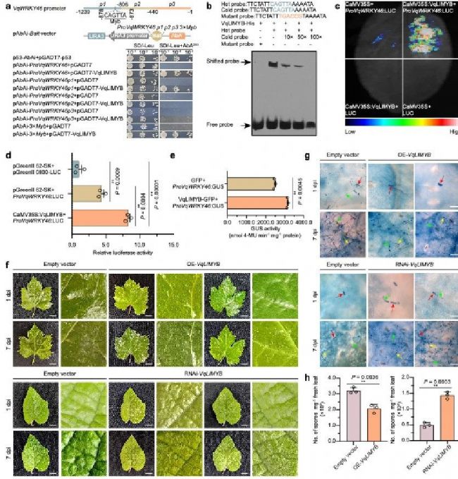 為探究VqWRKY46的上游調(diào)控機(jī)制,該研究通過(guò)酵母單雜交(Y1H)文庫(kù)篩選,鑒定到轉(zhuǎn)錄因子VqLIMYB。生物信息學(xué)分析顯示,VqWRKY46啟動(dòng)子區(qū)域存在MYB家族轉(zhuǎn)錄因子的典型結(jié)合基序(Myb motif: CAGTTA)。Y1H試驗(yàn)證實(shí),VqLIMYB可特異性結(jié)合該啟動(dòng)子區(qū)域。進(jìn)一步的凝膠遷移實(shí)驗(yàn)(EMSA)表明,VqLIMYB與Myb motif元件的直接互作具有序列特異性。雙熒光素酶報(bào)告系統(tǒng)(DLR)及GUS活性檢測(cè)結(jié)果顯示,VqLIMYB可顯著增強(qiáng)VqWRKY46啟動(dòng)子的轉(zhuǎn)錄活性。上述結(jié)果表明,VqLIMYB通過(guò)直接結(jié)合VqWRKY46啟動(dòng)子上的Myb motif元件,激活其表達(dá)。通過(guò)瞬時(shí)轉(zhuǎn)化技術(shù)獲得VqLIMYB過(guò)表達(dá)和缺失轉(zhuǎn)基因植株(OE-VqLIMYB、RNAi-VqLIMYB),接種白粉菌后的表型分析顯示,VqLIMYB過(guò)表達(dá)顯著增強(qiáng)葡萄對(duì)白粉病的抗性。