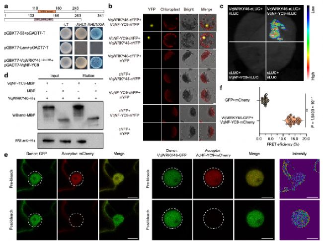 為解析VqWRKY46的互作蛋白網(wǎng)絡(luò),利用酵母雙雜交(Y2H)文庫(kù)篩選獲得轉(zhuǎn)錄因子VqNF-YC9。通過(guò)Y2H驗(yàn)證、雙分子熒光互補(bǔ)(BiFC)、分裂熒光素酶互補(bǔ)(Split-LUC)、Pull-down及熒光共振能量轉(zhuǎn)移(FRET-AB)等試驗(yàn),證實(shí)VqWRKY46與VqNF-YC9存在直接互作。此外還發(fā)現(xiàn),VqWRKY46與VqNF-YC9均可通過(guò)自身互作形成同源二聚體。