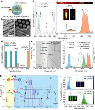 圖1:(a-b) Tm3+摻雜的立方相納米顆粒核殼結(jié)構(gòu)示意圖及電鏡圖;(c-d) Tm3+摻雜的立方相及六方晶相納米顆粒發(fā)射光譜及不同波長處發(fā)光強度柱狀圖;(e) 低溫吸收光譜;(f) 基于Tm3+、Er3+、Ho3+摻雜的立方相納米顆粒發(fā)射光譜及脂肪乳劑的吸收、散射曲線;(g) Yb-Tm體系能量傳遞機理;(h)Er3+和Ho3+元素摻雜的立方相和六方相納米顆粒的發(fā)射光譜及熒光成像圖。