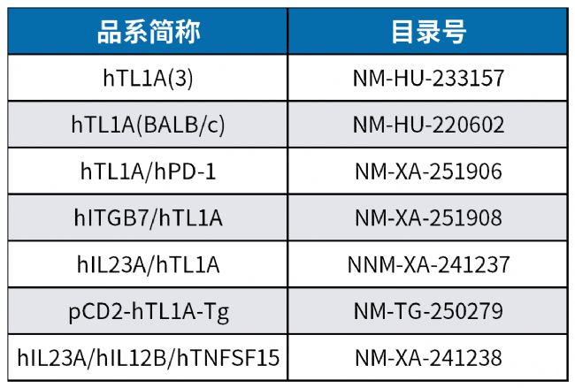 南模生物長期致力于藥物靶點人源化模型研究領域,針對TL1A信號通路的相關靶點開發(fā)了一系列人源化小鼠模型,并在不同背景小鼠上基于不同誘導方法建立了穩(wěn)定的IBD疾病模型,可用于炎癥性腸炎的臨床前研究和藥效評價。