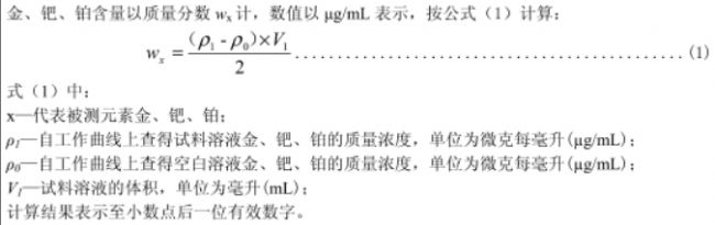 1.7.4.5.2在電感耦合等離子體發(fā)射光譜儀最佳工作條件下,測(cè)定空白溶液和試料溶液(1.7.4.5.1)中金、鈀、鉑的發(fā)射強(qiáng)度。從標(biāo)準(zhǔn)工作曲線(xiàn)上查出相應(yīng)金、鈀、鉑的質(zhì)量濃度。