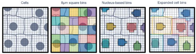 由于這些方塊比單個(gè)細(xì)胞小,這種方法能夠表征每個(gè)bin中存在的主要細(xì)胞類型。鑒于這種bin策略以及真核細(xì)胞的平均大。10 至 100 µm),每個(gè)bin區(qū)域可能涵蓋不止一個(gè)細(xì)胞的組成部分,因此,bin的分析方法提供了我們所說的單細(xì)胞級(jí)分辨率。Space Ranger4.0版本分析軟件更新,在提供高清H&E 顯微鏡圖像時(shí),會(huì)自動(dòng)對(duì) Visium HD 和 Visium HD 3' 數(shù)據(jù)執(zhí)行基于細(xì)胞核的細(xì)胞分割。