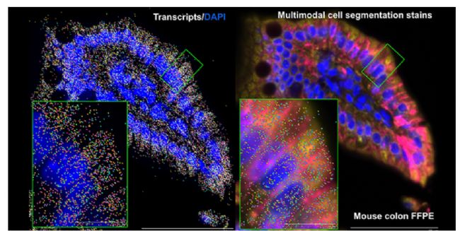 Xenium 原位技術(shù)可將轉(zhuǎn)錄本分配到單個(gè)細(xì)胞。在 Xenium 運(yùn)行過程中,每個(gè)轉(zhuǎn)錄本都會(huì)被分配到組織內(nèi)的 X-Y-Z 坐標(biāo)上。隨后,儀器會(huì)在運(yùn)行期間執(zhí)行多模態(tài)細(xì)胞分割,該過程利用多種形態(tài)學(xué)染色方法和專門構(gòu)建的人工智能算法來識(shí)別單個(gè)細(xì)胞的邊界。