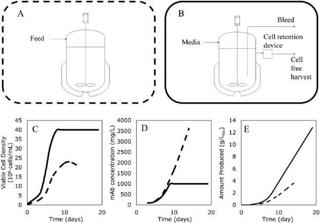 生產(chǎn) mAb 的細(xì)胞系的補(bǔ)料分批 (A) 和灌注 (B) 過程示意圖。細(xì)胞密度 (C)、生物反應(yīng)器內(nèi)的蛋白質(zhì)濃度(D) 和總生產(chǎn)率 (E);虛線代表補(bǔ)料分批,實(shí)線代表灌注。[1]