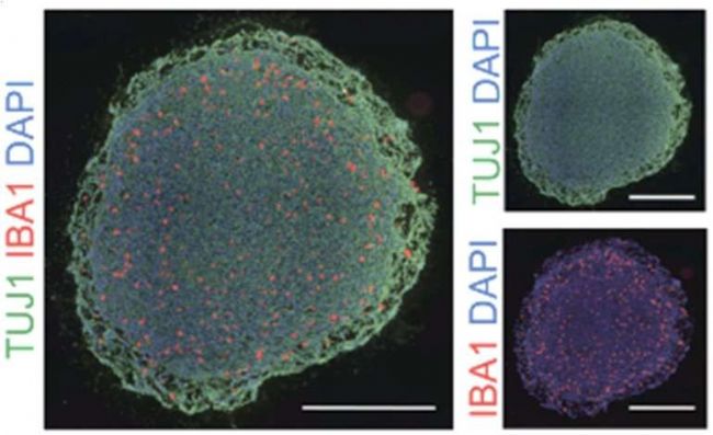 顯微鏡下,紅色熒光標記的微膠質(zhì)細胞(IBA1⁺)像夜空中的星火,均勻鋪展在綠色熒光描繪的大腦類器官(TUBB3⁺)中