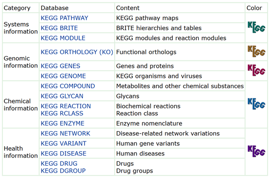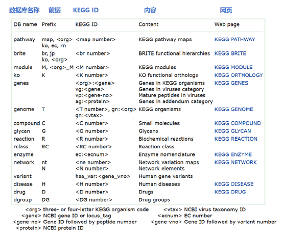 1. KEGG數(shù)據(jù)庫(kù)中包括各種數(shù)據(jù)對(duì)象,這些內(nèi)容均配有標(biāo)識(shí)符(KEGG ID)唯一標(biāo)識(shí),標(biāo)識(shí)符由一個(gè)與數(shù)據(jù)庫(kù)相關(guān)的前綴加上五個(gè)數(shù)字構(gòu)成。(見(jiàn)圖5)