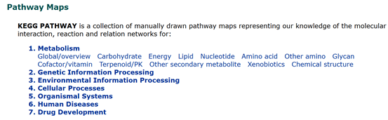 2. KEGG Pathway數(shù)據(jù)庫(kù)將生物代謝通路劃分為7大類(lèi)(A級(jí)分類(lèi))(見(jiàn)圖6),分別為:新陳代謝(Metabolism)、遺傳信息處理(Genetic Information Processing)、環(huán)境信息處理(Environmental Information Processing)、細(xì)胞過(guò)程(Cellular Processes)、生物體系統(tǒng)(Organismal Systems)、人類(lèi)疾。℉uman Diseases),藥物開(kāi)發(fā)(Drug Development)[網(wǎng)頁(yè)版KEGG]。其中每大類(lèi)又被系統(tǒng)分類(lèi)為B、C、D 3個(gè)級(jí)別。其中B級(jí)分類(lèi)目前包括有50種子功能:C級(jí)分類(lèi)即為代謝通路圖:D級(jí)分類(lèi)為每個(gè)代謝通路圖的具體注釋信息。