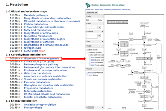登陸KEGG的官網(wǎng)(https://www.genome.jp/kegg/),進(jìn)入KEGG首頁(yè)。點(diǎn)擊“kegg pathway”,將會(huì)進(jìn)入kegg的通路列表,如圖7。從這個(gè)列表,我們可以知道,kegg的通路分類(lèi)也是分層級(jí)的。層級(jí)一共可以分為三級(jí)。以下圖7為例,在Metabolism為A級(jí),其下面包括了“Global and overview maps”、“Carbohydrate metabolism”、“Energy metabolism”等十幾個(gè)B級(jí)通路。而B(niǎo)級(jí)通路下又會(huì)包含若干C級(jí)通路。比如圖7中的“Global and overview maps”下面又包含了若干個(gè)下一級(jí)(C級(jí))通路如“Glycolysis / Gluconeogenesis”。我們通?瓷欧治鯧EGG的結(jié)果,看到的通路名稱(chēng)其實(shí)就是C級(jí)的結(jié)果。點(diǎn)擊“Glycolysis / Gluconeogenesis”即進(jìn)入“Glycolysis / Gluconeogenesis”代謝通路圖。