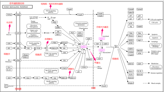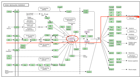 可以看到,F(xiàn)OXO上游還先后受Insulin和Pl3k-Akt兩個(gè)信號(hào)通路調(diào)控,下游可調(diào)控細(xì)胞周期、凋亡、自噬等多種過(guò)程
