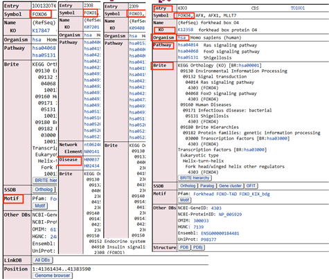 點(diǎn)擊“FoxO signaling pathway”中的FOXO這個(gè)基因,就會(huì)跳轉(zhuǎn)到FOXO基因的介紹頁(yè)面。在基因介紹的部分,涉及的信息主要包括:(1)基因信息(Entry, Name, Definition)(2)Pathway,該基因參與了哪些通路(3)Disease,該基因涉及哪些疾病(4)Brite,該基因涉及的通路的分級(jí)關(guān)系,即展示A級(jí)通路-B級(jí)通路-C級(jí)通路-基因的分層級(jí)關(guān)系信息)(5)genes,該基因的各個(gè)物種中的同源基因。前三個(gè)字母是這個(gè)物種拉丁名的簡(jiǎn)寫(xiě),例如,HSA代表人。(6)該基因的參考文獻(xiàn)的信息。kegg提供的參考文獻(xiàn)都是比較經(jīng)典的關(guān)于這個(gè)基因的文獻(xiàn),值得翻一翻。