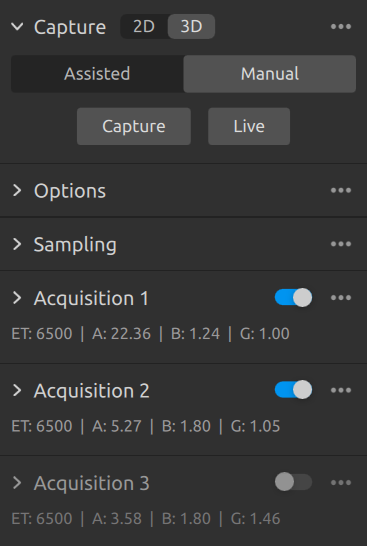 選擇“Manual Mode”后,您就可以點(diǎn)擊“Add Acquisition”(添加采集) 按鈕添加其他采集項(xiàng)。默認(rèn)情況下,添加的每個(gè)新采集項(xiàng)都使用上一個(gè)采集項(xiàng)的設(shè)置。如果您需要克隆某個(gè)采集項(xiàng),您可以單擊該采集項(xiàng)旁邊的三個(gè)點(diǎn),然后點(diǎn)擊“Clone”(克隆)。使用同一菜單重置采集設(shè)置或刪除單個(gè)采集項(xiàng)。使用復(fù)選框禁用或啟用采集項(xiàng)。單擊“HDR”按鈕捕獲具有指定采集設(shè)置的圖像;未選中的采集項(xiàng)將被忽略
