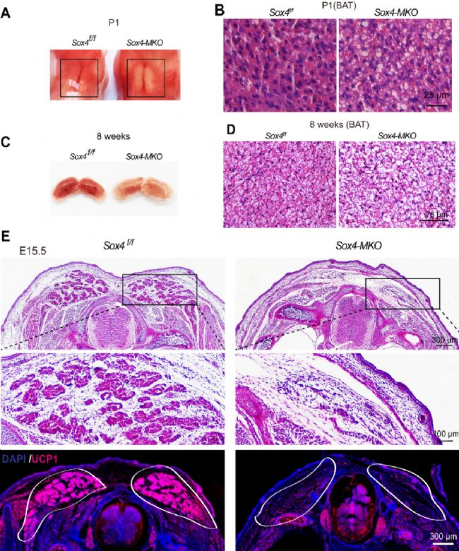 (A-B)出生后一天(雄鼠)的Sox4f/f和Sox4-MKO小鼠背部棕色脂肪的解剖圖(A),(B)為兩組小鼠棕色脂肪的H&E染色圖,標(biāo)尺為25 μm。(C-D)8周齡(雄鼠)的Sox4f/f和Sox4-MKO小鼠背部棕色脂肪的解剖圖(C),(D)為兩組小鼠棕色脂肪的H&E染色圖,標(biāo)尺為75 μm。(E)E15.5天(雄鼠)的Sox4f/f和Sox4-MKO小鼠背部棕色脂肪橫切面的H&E染色圖和UCP1免疫熒光染色圖,標(biāo)尺如圖所示。