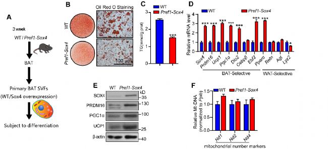 為了進(jìn)一步確認(rèn)SOX4的過表達(dá)能否促進(jìn)棕色脂肪細(xì)胞的分化,研究人員又從WT小鼠和Pref1-Sox4過表達(dá)小鼠的棕色脂肪組織中分離了BAT SVF細(xì)胞進(jìn)行體外誘導(dǎo)實(shí)驗(yàn)(圖4 A)。如圖4 B所示,過表達(dá)組細(xì)胞的脂滴囤積明顯少于對(duì)照組細(xì)胞,TG含量檢測(cè)實(shí)驗(yàn)進(jìn)一步表明SOX4的過表達(dá)能明顯降低細(xì)胞內(nèi)TG的含量(圖4 C)。研究人員還進(jìn)一步探究了SOX4的過表達(dá)對(duì)產(chǎn)熱基因的影響,如圖4 D所示,SOX4的過表達(dá)明顯促進(jìn)了Ucp1、Pgc1α、Prdm16、Pparα和Dio2等產(chǎn)熱基因的表達(dá),但是SOX4的過表達(dá)并不會(huì)影響白色選擇性基因Retn和Agt的表達(dá)水平,僅僅會(huì)使Lyz2的表達(dá)水平輕微下調(diào)。如圖4 E所示,SOX4的過表達(dá)能促進(jìn)PGC1-α、UCP1和PRDM16等蛋白的表達(dá)。最后研究人員還提取了兩組細(xì)胞的DNA,檢測(cè)了Nd1、Nd2和Nd4的表達(dá)水平。如圖4 F所示,SOX4的過表達(dá)并沒有改變Nd1、Nd2和Nd4的表達(dá)水平,說明SOX4的過表達(dá)并沒有促進(jìn)線粒體合成。