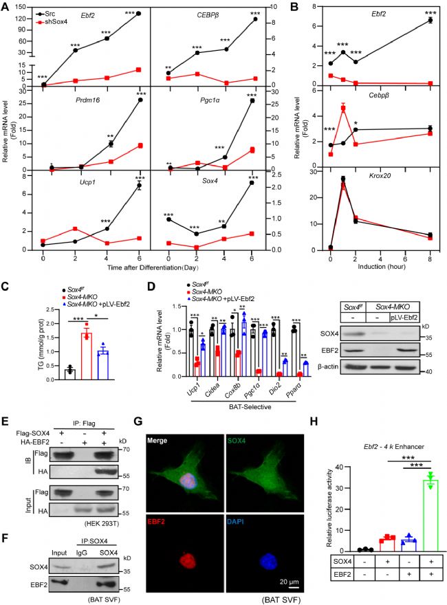 在加入誘導(dǎo)劑后的第0天、第2天、第4天和第6天分別收細(xì)胞,通過RT-PCR檢測(cè)調(diào)控棕色脂肪發(fā)育早期,中期和晚期轉(zhuǎn)錄因子的mRNA水平。(B)對(duì)對(duì)照組細(xì)胞和敲低組細(xì)胞進(jìn)行棕色化誘導(dǎo),分別在誘導(dǎo)的第0 h,第1 h,第2 h,第8 h,第12 h進(jìn)行定點(diǎn)收樣,用RT-PCR檢測(cè)特定的基因。(C-D)在BAT SVF細(xì)胞中,先用慢病毒將Sox4敲低,再慢病毒過表達(dá)Ebf2,構(gòu)建穩(wěn)轉(zhuǎn)細(xì)胞系后進(jìn)行棕色化誘導(dǎo)。在誘導(dǎo)后的第7天,分別檢測(cè)細(xì)胞的TG水平和產(chǎn)熱基因的mRNA水平。(E-G)內(nèi)源IP、外援IP和免疫熒光證明SOX4與EBF2相互結(jié)合。(H)在NIH3T3細(xì)胞中,分別過表達(dá)SOX4, EBF2,或同時(shí)過表達(dá)SOX4和EBF2,分別檢測(cè)對(duì)EBF2的轉(zhuǎn)錄激活情況。