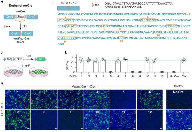 中科院周斌團隊對此進行了相關(guān)研究,研究者在 Cre 的12個不同位點分別插入了 rox 序列,其中大部分位于螺旋結(jié)構(gòu)域之間。由于插入額外的 rox 氨基酸會改變 Cre 的原始序列,他們將這種包含剩余 rox 位點的 Cre 稱為 mCre。研究者通過通過用12個版本的 mCre(mCre1~mCre12)和響應(yīng)的GFP報告基因轉(zhuǎn)染細胞來篩選它們的重組效率。結(jié)果證明,mCre1、2、3、4、6、7、10和11的效率與傳統(tǒng)Cre相當。說明通過合適的插入位點設(shè)計,包含 rox 位點的 Cre 與 普通 Cre 的重組效率可保持一致。