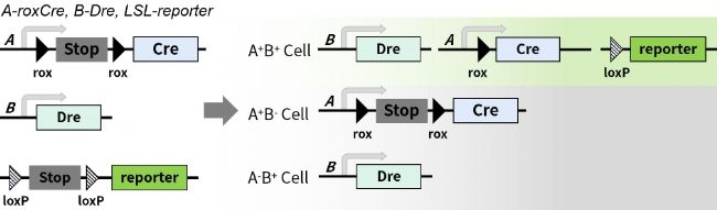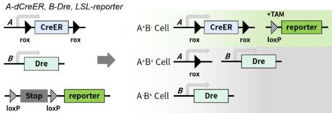 若我們想標記 A+B+ 細胞,我們就可以利用啟動子 A 介導的 roxCre 小鼠、啟動子 B 驅(qū)動的 Dre 小鼠、以及 LSL-Reporter 小鼠進行交配: