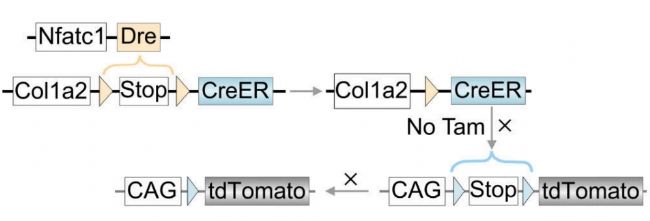 以心內(nèi)膜衍生成纖維細胞為例,研究者利用了心內(nèi)膜細胞marker Col1a2 與成纖維細胞 marker Nfatc1,構(gòu)建了以下小鼠:Nfatc1-Dre;Col1a2-RSR-CreER;R26-RL-GFP。