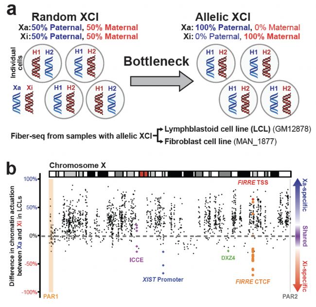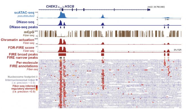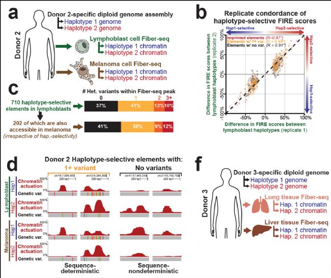 來自華盛頓大學(xué)的研究團隊開發(fā)了FIRE(Fiber-seq Inferred Regulatory Elements) 方法,通過Fiber-seq技術(shù)(基于HiFi測序的染色質(zhì)可及性檢測方法)實現(xiàn)了對人類 6 Gbp 二倍體基因組的單倍型分辨染色質(zhì)可及性分析。FIRE 克服了短讀長測序的局限,能精準(zhǔn)識別調(diào)控元件,揭示了單倍型選擇性染色質(zhì)可及性(HSCA) 的廣泛存在,包括新型印記元件(不依賴親源 CpG 甲基化差異)、疾病相關(guān)遺傳變異對調(diào)控模式的破壞、HLA 基因座的高調(diào)控多樣性,以及體細(xì)胞表觀突變(mitotically stable)的克隆擴張機制。此外,該方法解析了 X 染色體失活(XCI)中 CTCF 元件的邊界作用及基因逃逸機制,為理解人類基因調(diào)控的復(fù)雜性和疾病機制提供了全新視角。這一研究成果于2025年6月發(fā)表于預(yù)印本bioRxiv上:A haplotype-resolved view of human gene regulation(https://doi.org/10.1101/2024.06.14.599122)。